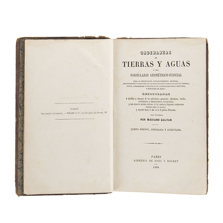 Subasta 1012, Lote # 167 Galván, Mariano. Ordenanzas de Tierras y Aguas. París: Librería de Rosa y Bouret, 1868. 8o. marquilla, 298 p. Dos láminas. Quinta edición. Formulario geométrico-judicial para la designación, establecimiento, mensura, amojonamiento y deslinde de las poblaciones y todas suertes de tierras, sitios, caballerías y criaderos de ganados mayores y menores, y mercedes de agua: recopiladas á beneficio y obsequio de los pobladores, ganaderos, labradores, dueños, arrendatarios y administradores de haciendas, y toda clase de predios rústicos, de las muchas y dispersas resoluciones dictadas sobre la materia, y vigentes hasta el día en la República Mexicana. Pastas y lomo gastados y con faltantes; cofia y pie con faltantes; cajo anterior quebrado en parte superior. Texto con manchas de humedad. Encuadernado en pasta dura, en piel. Estimado $3,000-4,000