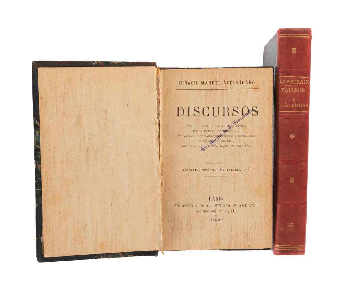 Subasta 1012, Lote # 175 Altamirano, Ignacio Manuel. Paisajes y Leyendas / Discursos. a) Paisajes y Leyendas. Tradiciones y Costumbres de México. México: Imprenta y Litografía Española, 1884. 8o. marquilla, 484 p. + 1 h. (Índice). Gracia anterior deteriorada. De punto a surco de polilla de pasta anterior a página 53. Encuadernado en pasta dura, lomo en piel. b) Discursos Pronunciados en la Tribuna Cívica, en la Cámara de Diputados, en Varias Sociedades Científicas y Literarias y en Otros Lugares, desde el Año de 1859 hasta el de 1884. París: Biblioteca de la Europa y la América, 1892. 8o. marquilla, V - VIII + 455 p. Sello y firma de antiguo propietario. Gracias quebradas, guarda anterior desprendida; texto con manchas de óxido; algunas páginas con pequeñas rasgaduras en margen superior. Encuadernado en pasta dura, lomo en piel. Total de piezas: 2. Estimado $6,000-8,000