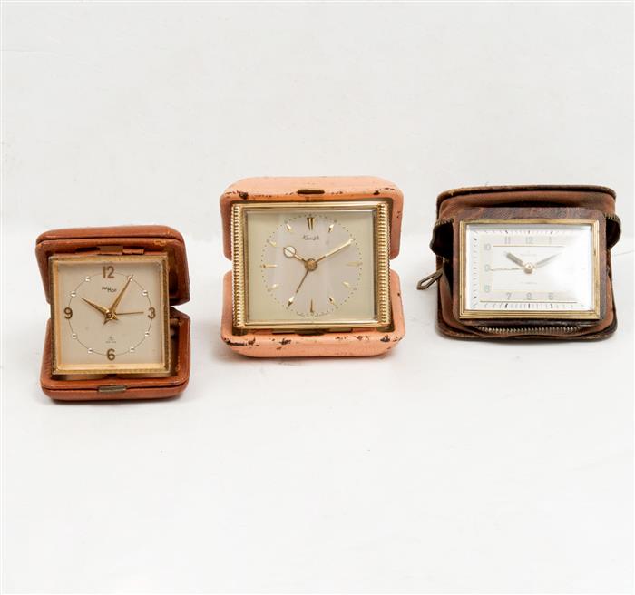 b) Marca Imhof. Mecanismo de cuerda. Diseño rectangular, índices arábigos y manecillas tipo espada. Decorado con simulantes. En estuche.