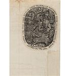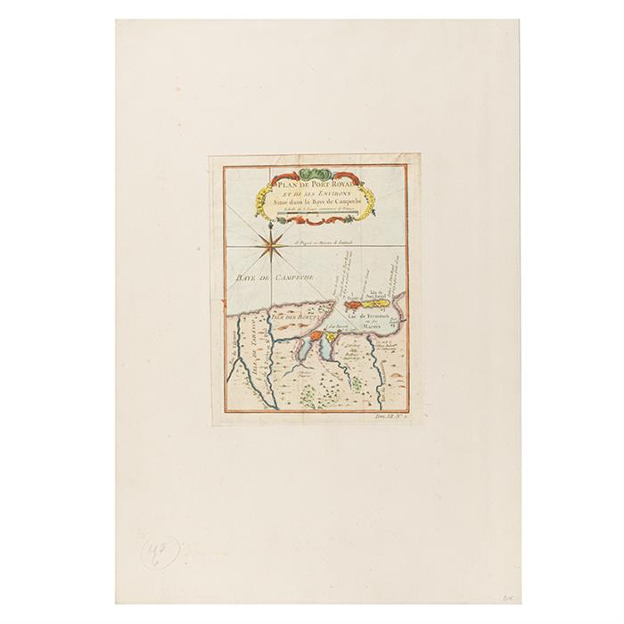 Bellin, Jacques.Plan de Port Royal et de ses environs Situé dans la Baye de Campeche. París: Chez Didot, 1754. Grabado coloreado, 20.3 x 15.2 cm.; hoja completa 23 x 18 cm. Tomado de la obra: "Histoire générale des voyages, ou Nouvelle collection de toutes les relations de voyages…". Ex Libris de Antonio Castro Leal al reverso. Reforzado en margen izquierdo. En marialuisa. Estimado $4,000-6,000