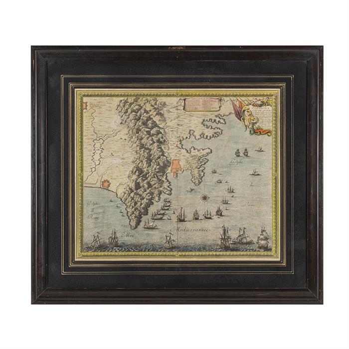 Subasta 1030, Lote # 160 Beaulieu, Sébastien Pontault de. Plan de la Ville de Cap de Quiers. París, ca. 1694. Grabado coloreado, 45.6 x 54.6 cm. Cartouche en esquina superior derecha. En Catalogne, assiegé et pris par les Armées du Roy tres chrétien Louis xuy, Commandées par Monsieur le Prince de Conty Vice-Roy de Catalogne, Roussillón et Cerdagne le jour de May 1655. Tomada de la obra "Les glorieuses conquestes de Louis le Grand". Enmarcado. El mapa representa el Sitio de Cadaqués, el asedio de las tropas francesas durante la sublevación de Cataluña en 1655. A partir de ese momento, el ejército francés permaneció hasta 1659, año en el que se firmó el Tratado de los Pirineos; los hombres que debían ocupar el sitio pasaron hambre y en muchas ocasiones, terminaron por desertar. Estimado $6,000-8,000