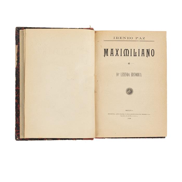 Subasta 1030, Lote # 85 Paz, Ireneo. Maximiliano. Décima Leyenda Histórica. México: Imprenta, Litografía y Encuadernación de Ireneo Paz, 1899. 4o. marquilla, frontispicio + 581 + II p. + 1 h. 19 láminas. Primera edición. Cajos quebrados. De página 577 a última hoja rasgadas en tercio medio afectan texto. Encuadernado en pasta dura, en piel. Palau: 215694. A diferencia de otras obras históricas sobre el Segundo Imperio, la finalidad de la presente obra es sobre todo instructiva: busca exponer los principales sucesos de dicho período de una manera sencilla y accesible para el pueblo mexicano: "... la misión principal que lleva la presente leyenda, hay que decirlo con toda franqueza, es que nuestro pueblo tenga, a poco costo, una relación verídica de todo cuanto pasó en el país durante la aciaga época de la Intervención Francesa y del Imperio de Maximiliano, a fin de que nadie ignore ni en esta ni en las futuras generaciones, los nombres de aquellos que hicieron el mal ni los de aquellos que supieron sacrificarse en servicio de la patria". Con esta misma idea en mente, las láminas litográficas, algunas de ellas rayando en lo caricaturesco, presentan diversos episodios de esta tragicomedia de la vida real. Rara en comercio. Dos registros de venta en subasta pública, 19 láminas; Morton, 2004; 2012. Véase en: Introducción. Estimado $10,000-12,000