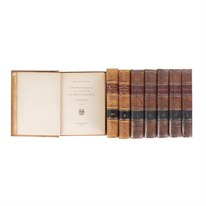 4o. marquilla, LXXXIV + 396; 418; 390; 446; 339 p. Tomos I - V. Tomo I: Contiene los libros I, II, III y IV. Retrato del autor, dos tablas plegadas y cuatro láminas a color. Tomo II: Contiene los libros V, VI, VII, VIII y IX. Seis láminas a color. Tomo III: Contiene los libros X y XI. Cinco láminas a color. Tomo IV: Contiene libro XII: La Conquista de México. Cinco láminas a color. Tomo V: Los Cantares a los Dioses: La Orfebrería, el Arte de Trabajar las Piedras Preciosas y de hacer Ornamentos de Plumas, de los Antiguos Mexicanos. Cuatro láminas a color. De esta edición se tiraron cien ejemplares en papel "Hammermill Ledger", numerados del 1 al 100. Ejemplar sin numerar. Ex Libris de Alfonso Pulido Islas. Encuadernados en pasta dura. Piezas: 5.