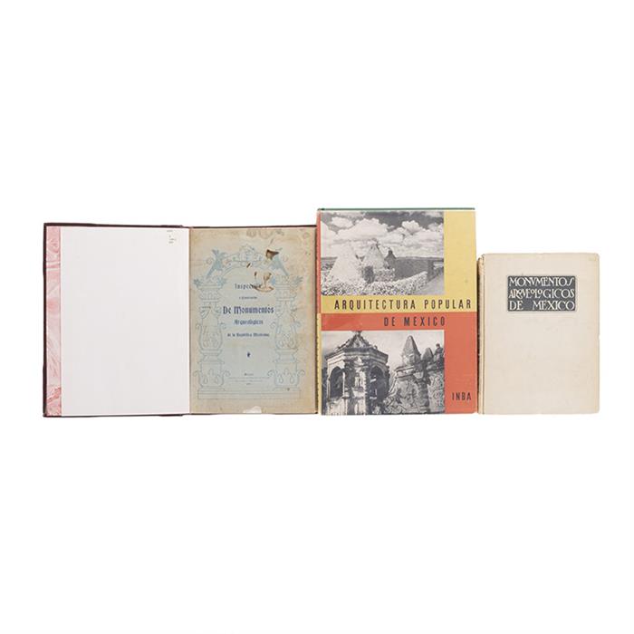 Subasta 1041, Lote # 31 Batres, Leopoldo / Chávez, Carlos. Inspección y Conservación de Monumentos Arqueológicos / Monumentos Arqueológicos de México / Arquitectura Popular de México. a) Leopoldo Batres. Inspección y Conservación de Monumentos Arqueológicos de la República Mexicana. Visita a los Monumentos Arqueológicos de "La Quemada", Zacatecas. México: Imprenta de la Vda. de Francisco Díaz de León, 1903. 4o. marquilla, 43 p + 26 láminas numeradas + 2 láminas (una a color y otra plegada) + 4 planos (3 plegados). Conserva pastas originales en rústica, deterioradas y manchadas. Ejemplar con mancha de humedad en media caña. Encuadernado en pasta dura. b) Monumentos Arqueológicos de México. México: Talleres Gráficos de la Nación, 1933. 4o., XIV + 150 p. + 4 h. Encuadernado en pasta dura. Explica, principalmente con láminas, la importancia de la distribución geográfica de las ruinas arqueológicas de México, testigos fieles de la grandeza de las civilizaciones a las que pertenecieron. Chávez, Carlos (Introducción). Arquitectura Popular de México. México: Instituto Nacional de Bellas Artes, 1954. 4o. marquilla, 213 p. Encuadernado en pasta dura. Total de piezas: 4. Estimado $4,000-5,000