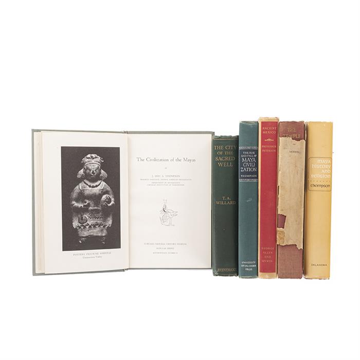 Subasta 1041, Lote # 29 Ancient Mexico & Maya. Peterson, Frederick / Morris, Earl H. / Willard, T. A. / Thompson, J. Eric S. / Ancient Mexico / The Temple of the Warriors / The City of the Sacred Well / The Rise and Fall of Maya Civilization / The Civilization of the Mayas / Maya History and Religion. a) Peterson, Frederick. Ancient Mexico. London: Ruskin House - George Allen & Unwin Lted. 1959. 4o. marquilla, 313 p. An Introduction to the Pre-Hispanic Cultures. maps and drawings by José Luis Franco. Encuadernado en pasta dura. b) Morris, Earl H. The Temple of the Warriors. New York: Charles Scribner's Sons, 1931. 4o., XII + 251 p. Cubierta muy deteriorada. Encuadernado en pasta dura. c) Willard, T. The City of the Sacred Well. London: William Heinemann, Ltd., 1926. 8o. marquilla, XVI + 293 p. Sin refinar. Encuadernado en pasta dura. d) Thompson, J. Eric S. The Rise and Fall of Maya Civilization. Norman, Oklahoma: University of Oklahoma Press, 1954. 4o. marquilla, XIV + 287 p. Encuadernado en pasta dura. e) Thompson, J. Eric S. The Civilization of the Mayas. Chicago: Chicago Natural History Museum, 1953. 8o. marquilla, 96 p. Encuadernado en pasta dura. f) Thompson, J. Eric S. Maya History and Religion. Norman, Oklahoma: University of Oklahoma Press, 1970. 4o. marquilla, XXX + 415 p. Encuadernado en pasta dura. Total de piezas: 6. Estimado $2,000-3,000