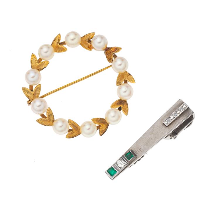 Prendedor y pisacorbata con perlas. diamantes y esmeraldas en oro amarillo y blanco de 10k y 14k. 10 perlas cultivadas color blanco de 5 mm. 2 esmeraldas corte cojín. 4 diamantes corte baguette y 8 x 8. Peso: 9.1 g.