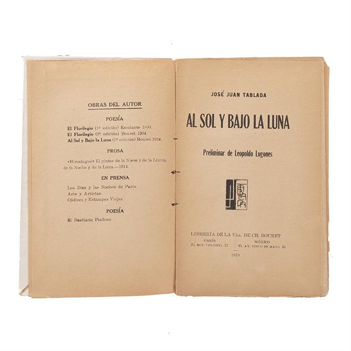 Subasta 1051, Lote # 77 Tablada, José Juan. Al Sol y Bajo la Luna. París - México: Librería de la Viuda de Ch. Bouret, 1918. 8o. marquilla, 240 p. Prólogo de Leopldo Lugones; Portada de Jorge Enciso; Kalograma de Torres Palomar. Primera Edición. Sin refinar. No hay página 177-178, una hoja sin paginar intercalada entre las páginas 192 - 193. Lomo deteriorado, cajos quebrados. Encuadernado en pasta dura. José Torres Palomar (1873 - 1920), ingeniero civil y arquitecto de formación, murió en la ciudad de Nueva York a finales de 1920. Buena parte del empeño artístico de Torres Palomar quedó en algo que él llamó kalogramas, diseños originalísimos que trabajó en Nueva York durante la segunda década del siglo 20. "Un kalograma", explicó Torres Palomar, "es la imagen psicológica de un individuo expresada en colores, por medio de las letras de su nombre". Kalograma significa letras bellas, pero el objeto de Torres Palomar no sólo era hacer la combinación de las letras tan bella como fuera posible, "sino conferirles un sentido". Y añadió: "En cada uno de los grupos ordenados armoniosamente, hay pues alguna característica o peculiaridad de la persona, que me sirvió de inspiración". https://vlex.com.mx Estimado $6,000-8,000