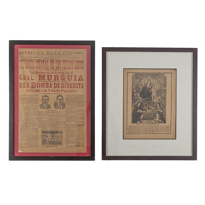 Subasta 1051, Lote # 169 Posada, José Guadalupe / Vanegas Arroyo, Blas. Refugio de Pecadores / Portadas de Cuadernillos / El Boletín de Menudencias. a) Posada, José Guadalupe. Refugio de Pecadores. Oración a Nuestra Sra. del Refugio. México: Antonio Vanegas Arroyo, principios del S. XX. Hoja volante, 40 x 29. 5 cm. Enmarcada. b) Posada, José Guadalupe. Portadas de Cuadernillos. México: Antonio Vanegas Arroyo, principios del S. XX. Selecta Recopilación de Canciones Modernas - Don Perabel. Cuento - Blanca Nieves y los Siete Enanos. Cuento - El Trovador Popular. Escogidas y Bonitas Canciones para el Presente Año. Enmarcadas. Piezas: 4. c) Vanegas Arroyo, Blas. Extra. El Boletín de Menudencias. Diario de Medio Día. México: Blas Vanegas Arroyo, principios del S. XX. Una hoja, 59 x 38.5 cm. Triunfo Colosal de los Ferroviarios - Los Huelguistas de Acuerdo con el Gral. Murguía - Una Bomba de Dinamita Arrojada a un Tren de Pasajeros. Impresa a dos tintas. Enmarcada. Total de piezas: 6 Estimado $6,000-8,000