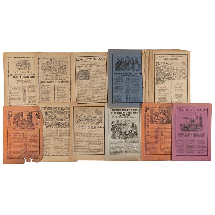 K - Posada, José Guadalupe. Pleitos - Noticias Horrorosas - Fusilamientos - Desastres. Hojas Volantes. México: Imprenta de Antonio Vanegas Arroyo, principios del Siglo XX. - El Mosquito Americano. - ¡Terrible y Verdadera Noticia! - Aventuras de un Catrín por Amar a una Casada. - Pleitos de Casados que Siempre Están Enojados (2). - Horripilante Crimen. Una Mujer que mata a su hijo en Tacubaya el Sábado 18 de Marzo del presente año de 1905. - ¡Horrorosa Noticia! Robo Sacrílego y asesinato del señor Cura en la Iglesia Parroquial de Zahuaya cometido por un impío llamado Celso Flores. - Espantosísima y Alarmante Noticia! De una hija que asesinó a su padre y a su madrastra, en una población del Estado de Jalisco. - Increíble Suceso de una Mujer que se Convirtió en Piedra. - Ya la Vieja de mi Suegra / Nomas quiere Regañar, / Deatiro la Corta Verde / No la Deja Madurar. - Nuevo y Divertido Pleito de una Suegra con su yerno. - La Continuación, Señores de los Pronósticos va; Apréndanselos de Memoria que ya se va a Acabar. - El Fusilamiento de Arnulfo Villegas. El Miércoles 12 de Febrero de 1908. - Fusilamiento de Florencio Morales y Bernardo Mora. - Jesús Negrete (a) el Tigre de Santa Julia. Fusilado en la Cárcel de Belem. El 22 de Diciembre de 1910. - Grandísima Inundación de Guanajuato. El Día 30 de Junio de 1905 a las 4 de la Tarde. - Los Terremotos del 26 de Marzo de 1908 en México. ¡Cinco temblores en Medio Día! ¡Varios Muertos y Heridos! - El Gran Descarrilamiento del Ferrocarril Central en zacatecas. ¡Diez Muertos y 75 Heridos! Varios formatos, 27.5 x 19 cm., promedio. Ocho deterioradas con faltantes en márgenes. Piezas: 23. Estimado $8,000-10,000