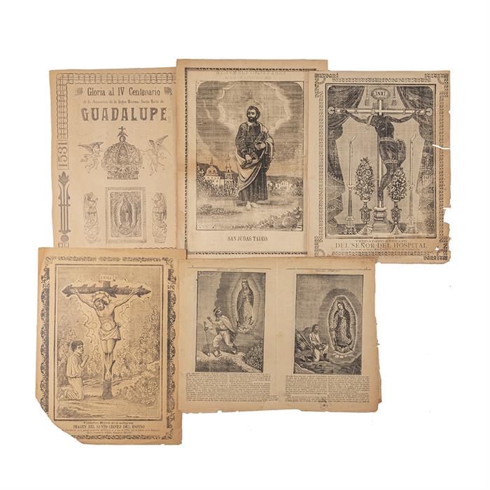 Subasta 1051, Lote # 188 K - Vanegas Arroyo, Antonio. Virgen de Guadalupe - San Judas Tadeo - Señor del Hospital - Santo Cristo del Espino. México: Testamentaria e Imprenta de Antonio Vanegas Arroyo / Imprenta Religiosa, principios del Siglo XX. - Gloria al IV Centenario de la Aparición de la Virgen Morena, Santa María de Guadalupe / Verdadera Tradición de las Cuatro Apariciones de la Virgen Morena Santa María de Guadalupe. - San Judas Tadeo / Espantoso Ejemplar y Sorprendentes Milagros que efectuaron el Santo Niño de Atocha San Judas Tadeo, en un Pueblo del Estado de Coahuila en el mes de Junio pasado. - Verdadero Retrato de la Milagrosa Imagen del Santo Cristo del Espino / Ejemplar y Espantosísimo Suceso en Chicaxtle, E. de Campeche. Falto de punta izquierda inferior, afecta texto. - Verdadero Retrato del Señor del Hospital que se Venera en la Villa de Salamanca (Estado de Guanajuato) / Horroroso y Singular Ejemplo acaecido en el Rancho llamado "Barrancas Hondas", perteneciente al Estado de San Luis. Deteriorado, faltantes en márgenes, afecta poco texto. - La Coronación de María Santísima de Guadalupe y sus cuatro Apariciones. 8 páginas, en pliego, pérdida de papel al centro, afecta poco el texto. 39 x 29.5 cm., promedio. Hojas impresas a dos caras. Piezas: 5. Estimado $4,000-6,000