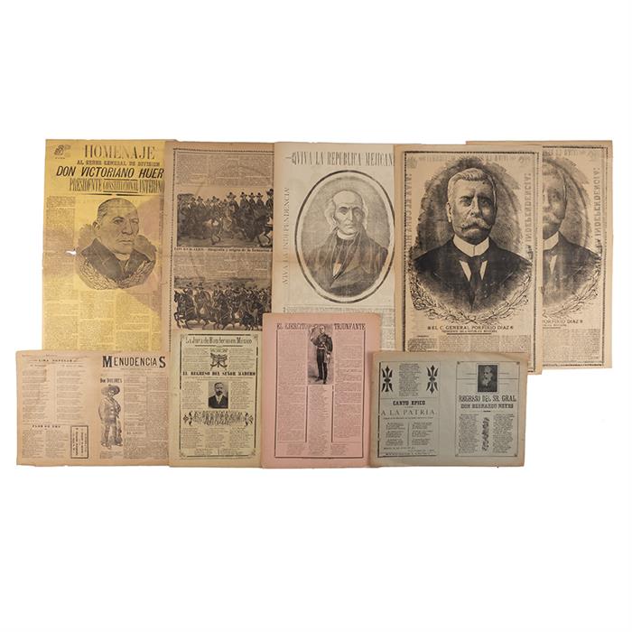 K - Vanegas Arroyo, A. - Posada, José Guadalupe. El Cura Hidalgo y Porfirio Díaz - El Cura Hidalgo y Los Rurales - Menudencias… México: Imprenta de Antonio Vanegas Arroyo, principios del Siglo XX. - ¡Viva la Independencia! ¡Viva la República Mexicana! ¡Viva El Cura Hidalgo! - 16 de Septiembre de 1810 - Himno Nacional Mexicano / El C. General Porfirio Díaz Presidente de la República Mexicana - Onomástico. Dos hojas impresas a doble cara. - ¡Viva la Independencia! ¡Viva la República Mexicana! ¡Viva El Cura Hidalgo! / Los Rurales. Biografía y Origen de la Formación de estos Cuerpos - Himno Nacional Mexicano. Hoja impresa a dos caras, 59 x 38.5 cm. Puntos de polilla. - ¡Viva la República Mexicana! ¡Viva El Cura Hidalgo! - ¡Viva la Colonia Morelos! - Una Página de Gloria. / Los Rurales. Biografía y Origen de la Formación de estos Cuerpos. Hoja impresa a dos caras, 59 x 38.5 cm. Surcos de polilla en márgenes. - Regreso del Sr. Gral. Don Bernardo Reyes. / Canto Épico Inédito a la Patria. Hoja impresa a dos caras, 30 x 40 cm. - El Ejército Triunfante. 40 x 30 cm. - La Jura de Banderas en México - El Regreso del Señor Madero a la Capital de la República, con motivo del Juramento de Banderas. 35. 5 x 24 cm. - Menudencias. Periódico del Pueblo. Tomo 1º - Núm. 2. México Septiembre 22 de 1919. 4 p. 30 x 40 cm. - Homenaje al Señor General de División Don Victoriano Huerta Presidente Constitucional Interino / El Caso México. La Democracia Yanki y la Doctrina Monroe. Hoja impresa a dos caras, 59 x 37.5 cm. Muy deteriorada, afecta el texto. Piezas: 9. Estimado $7,000-9,000
