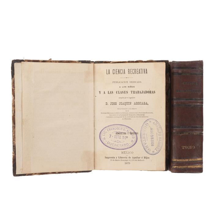 Subasta 1128T, Lote # 123 Arriaga, José Joaquín. La Ciencia Recreativa. México: Imprenta de J. M. Aguilar Ortíz / Imprenta y Librería de Aguilar é Hijos / Imprenta de Ancona y Peniche, 1871, 1873, 19875, 1879. Publicación dedicada a los niños y a las clases trabajadoras. Tomo I: -La Primera Semilla, 36 p. Geografía Física. Una Ascensión al Popocatepetl. -Física Eperimental y recreativa. Impresiones de Viaje del Tío Pablo. -Meteorología. Los Misterios de la Niebla. -Agricultura. Historia de un Grano de Café. -Mineralogía y Mdtalurgia. Vida y Aventuras de una Moneda de Cinco Centavos. -Física del Globo. Pluton y Neptuno. -Física Esperimental. Transformaciones de un trozo de hielo. -Metereología. Las Tempestades. -Meteorología. El Titán y el Pigmeo. -Física del Globo. Los Aerolitos. -Agricultura e Industria. Historia de un Pan de Azúcar. -Mineralogía. Lázaro el Leñador. -Física del Globo. El Mundo Aéreo. -Agricultura e Industria. Historia de un Pañuelo de Lino. -Zoología. Los Operarios de Mar. -Bótanica. Principios de Organografía y de Fisiología Vegetal. Cajos quebrados. Lomo y pastas gastados. Encuadernado en pasta dura, lomo en piel. Tomo II: -Agricultura e Industria. -El Cultivador del Maguey. -Manual de Horticultura y Jardinería. Con láminas. Cajos quebrados. Lomo y pastas gastados. Encuadernado en pasta dura, lomo en piel. Total de piezas: 2. Estimado $2,000-3,000