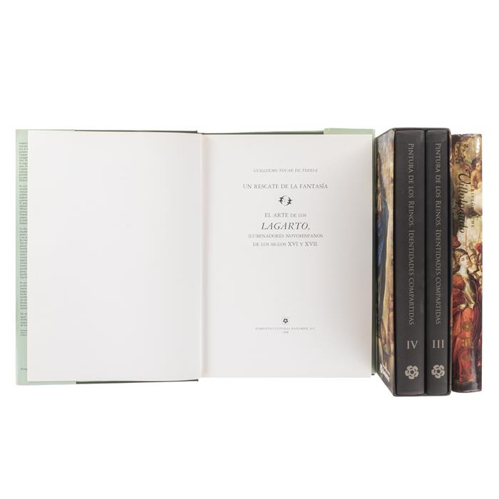 Subasta 1128T, Lote # 201 Libros sobre Arte. a) Gutiérrez Haces, Juana. Cristóbal de Villalpando. México: Fomento Cultural Banamex, 1997. 445 p. Catálogo razonado. Ilustrado. Encuadernado en pasta dura. b) Tovar de Teresa, Guillermo. Un Rescate de la Fantasía: El Arte de los Lagarto, Iluminadores Novohispanos de los Siglos XVI y XVII. México - Madrid: El Equilibrista - Turner Libros / Fomento Cultural Banamex, 1988. 239 p. Ilustrado. Encuadernado en pasta dura. c) Gutiérrez Haces, Juana. Pintura de los Reinos. Identidades Compartidas, Territorios del Mundo Hispánico, Siglos XVI - XVIII. México: Fomento Cultural Banamex, 2009. 761 - 1078; 1099 - 1503 p. Ilustrados. Encuadernados en pasta dura, en tela, con estuche. Total de piezas: 4. Estimado $1,500-2,000