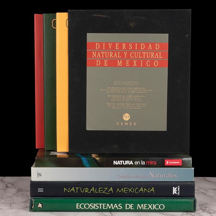 Subasta 1128T, Lote # 203 Libros sobre Naturaleza y Ecosistema Mexicanos. a) Robles Gil, Patricio. Diversidad Natural y Cultural de México. México: CEMEX, 1996. 191, 191, 191 p. México: Diversidad de Culturas / Diversidad de Flora Mexicana / Diversidad de Fauna Mexicana. Ilustrados. Encuadernados en pasta dura, en estuche. Piezas: 3. b) Grandes Maravillas Naturales. Madrid: LIBSA, 2008. Con 6 rompecabezas de 96 piezas. Encuadernado en pasta dura. c) Peréz Gil Salcido, Ramón. Ecosistemas de México. México: Banco BCH, 1984. 197 p. Ilusytrado. Encuadernado en pasta dura, en estuche. d) Ceballos, Gerardo. Naturaleza Mexicana. Legado de Conservación. México: Telmex, 2008. 303 p. Ilustrado. Encuadernado en pasta dura. e) Eccardi, Fulvio. Natura en la Mira. México: Gaia Editores, 2011. 223 p. Primera edición. Ilustrado. Encuadernado en pasta dura. Total de piezas: 7. Estimado $1,000-1,300