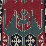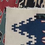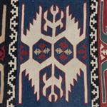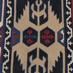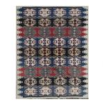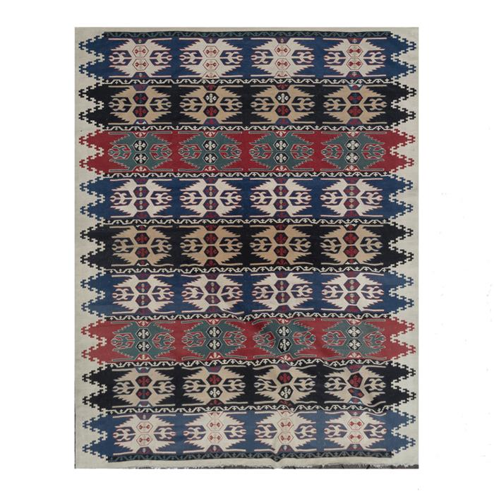 Decorado con elementos geométricos y orgánicos en colores azul, ocre, marrón y verde sobre fondo beige.