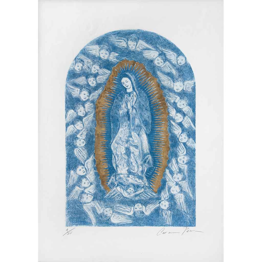 CARMEN PARRA (Ciudad de México, 1944 - ) Virgen de Guadalupe, 2019 Firmado Gofrado y grabado al aguatinta en cobre con hoja de oro 14 / 30 Con sello de agua del Taller Caracol Púrpura. 81 x 61.5 cm medidas totales Estimado $18,000-26,000