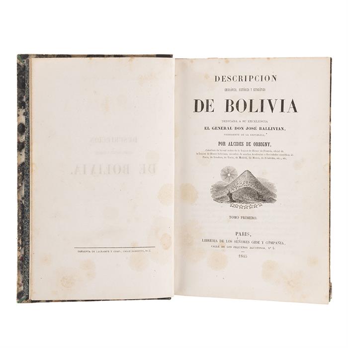 Subasta 1077, Lote # 135 Orbigny, Alcides de. Descripción Geográfica, Histórica y Estadística de Bolivia Dedicada a su Excelencia el General Don José Ballivian, Presidente de la República. París: Librería de los Señores Gide y Compañía, 1845. 8o. marquilla, LIV + 402 p. + 1 h. Primera edición. Tomo I, único publicado. Texto con ligeras manchas de humedad y de óxido. Gracias quebradas. Encuadernado en pasta dura, lomo en piel. Palau: 202186. Había el proyecto de publicar 10 tomos y atlas. Sabin: 57452. Announced to be complete in eleven volumes, with an atlas. Obra escrita por el naturalista y paleontólogo Alcide Dessalines d' Orbigny, quien en 1840 se dió a la tarea de hacer una monumental obra sobre la historia, cultura y recursos de Bolivia, pero sus diversas obligaciones lo distrajeron, y solo este tomo, que abarca las provincias centrales de Caupolican y Moxos, fue completado. Estimado $2,000-3,000