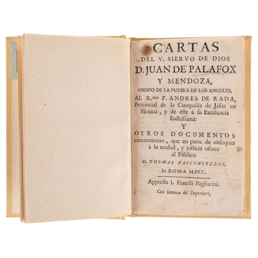Subasta 1077, Lote # 151 Cartas del V. Siervo de Dios D. Juan de Palafox y Mendoza, Obispo de la Puebla d e los Ángeles, al Rmo. P. Andrés de Rada, Provincial de la Compañía de Jesús en México, y de éste a su Excelencia Ilustrísima. Y Otros Documentos Concernientes, que en Parte de Obsequio a la Verdad, y Justicia ofrece al Público D. Thomas Vasconcelos. Roma: I. Fratelli Pagliarini, 1700. 16o. marquilla, 115 p. Primera edición. Página 93 a 115 con mancha de humedad en tercio inferior, afecta poco texto. Encuadernado en pasta dura. Palau: 209696. Menciona 192 p. Obra prohibida y recogida según edicto del 13 de mayo de 1759, falsamente impresos en Roma el año de 1700. En dicho edicto,menciona que la obra se había publicado sin las licencias necesarias, y contra las reglas del expurgatorio, para renovar controversias ya fenecidas, con solo el fin de calumniar y desacreditar con los fieles la religión de la Compañía de Jesús, contra la intención y buena memoria de aquel Prelado. Obra rara en mercado. Véase en: http://cdigital.dgb.uanl.mx/la/1080016474/1080016474_MA.PDF Estimado $4,000-6,000