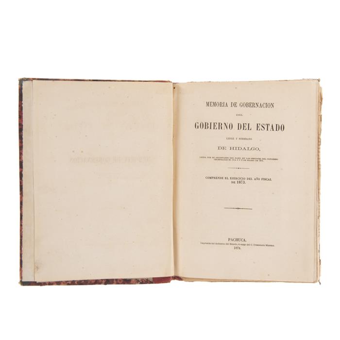 Memoria de Gobernación del Estado Libre y Soberano de Hidalgo. Pachuca: Imprenta del Gobierno del Estado, a cargo del C. Crescencio Moreno, 1874. 4o., 59 p. + 28 Cuadros plegados. Cuadros rasgados en doblez, afectan texto. Encuadernado en pasta dura, lomo en piel.