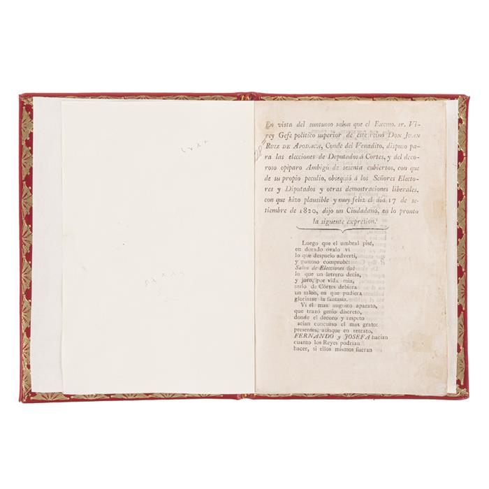 Subasta 1077, Lote # 166 En Vista del Suntuoso Salón que el Exmo, Sr. Virey Gefe Politico Superior de este Reino Don Juan Ruiz de Apodaca, Conde del Venadito, Dispuso para las Elecciones de Diputados a Cortes y del Decoroso Opíparo Ambigú de Sesenta Cubiertos, con que de su propio Peculo, Obsequio a los Señores Electores y Diputados y otras Demostraciones Liberales, con que hizo Plausible y muy Feliz el día 17 de Setiembre de 1820, dijo un Ciudadano en lo pronto la Siguiente Expresión. México: Imprenta de D. Juan Bautista de Arizpe, 1820. 8o. marquilla, 11 p. Encuadernado en pasta dura. El día 17 de septiembre de 1820, en la Nueva España se comenzaron a celebrar las elecciones provinciales para elegir a los diputados que se enviaron a las Cortes Españolas. Estimado $10,000-12,000