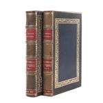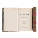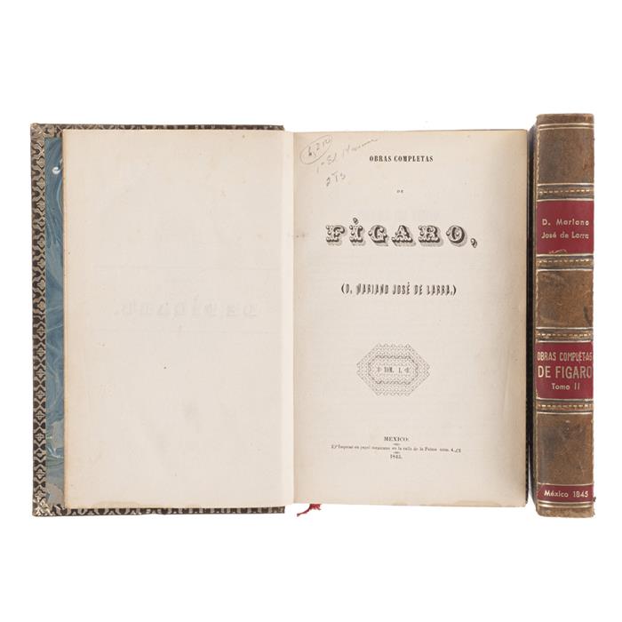 Subasta 1077, Lote # 255 Larra, Mariano José de. Obras Completas de Fígaro. México: Impreso en Papel Mexicano en la Calle de La Palma Núm. 4, 1845. 4o. marquilla, Frontispicio + VI + XX + 502 p. + 1 h.; 457 p. + 1 h. + XX p. Tomos I - II. Tomo I: Páginas 261 - 264 sin punta superior; gracia anterior quebrada. Tomo II: Biografía del tomo I, repetida al final; algunas páginas con manchas de humedad en tercio superior. Encuadernados en pasta dura, en piel. Piezas: 2. Palau: 131852. Primera edición mexicana de las obras completas de uno de los más grandes exponentes del Romanticismo español. Incluye biografía de Larra, obras como El Pobrecito Hablador, Colección de Artículos Dramáticos, Literarios, Políticos y de Costumbres, etc. Estimado $6,000-8,000