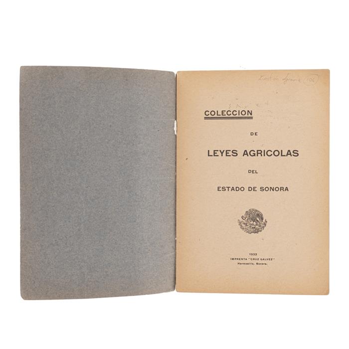 Calles, Rodolfo Elías. Colección de Leyes Agrícolas del Estado de Sonora. Hermosillo, Sonora: Imprenta "Cruz Galvez", 1933.