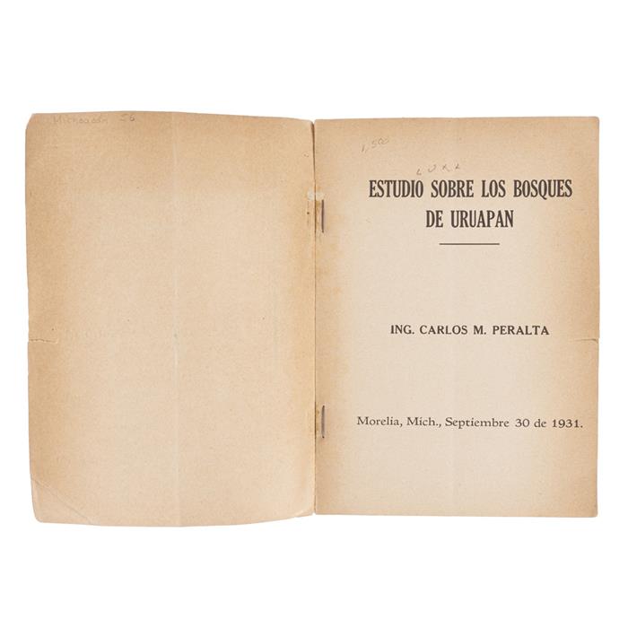 Peralta, Carlos. Estudio sobre los Bosques de Uruapan. Morelia, Michoacán, Septiembre 30 de 1931. 8o. marquilla, 93 p. Lomo rasgado. Pastas en rústica, engrapado. Estimado $2,000-3,000