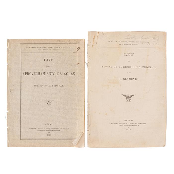 Subasta 1077, Lote # 240 Leyes y Reglamento sobre el Aprovechamiento de Aguas de Jurisdicción Federal, 1910 - 1911. a) Ley sobre Aprovechamiento de Aguas de Jurisdicción Federal. México: Imprenta y Fototipia de la Secretaría de Fomento, 1910. 8o. marquilla, 22 p. Secretaría de Fomento, Colonización e Industria de la República Mexicana. Puntos de polilla. Pastas en rústica, cosido. b) Ley de Aguas de Jurisdicción Federal y su Reglamento. México: Imprenta y Fototipia de la Secretaría de Fomento, 1911. 8o. marquilla, 24 + 24 p. (Reglamento). Secretaría de Fomento, Colonización e Industria de la República Mexicana. Sin pastas, engrapado. Total de piezas: 2. Estimado $10,000-12,000