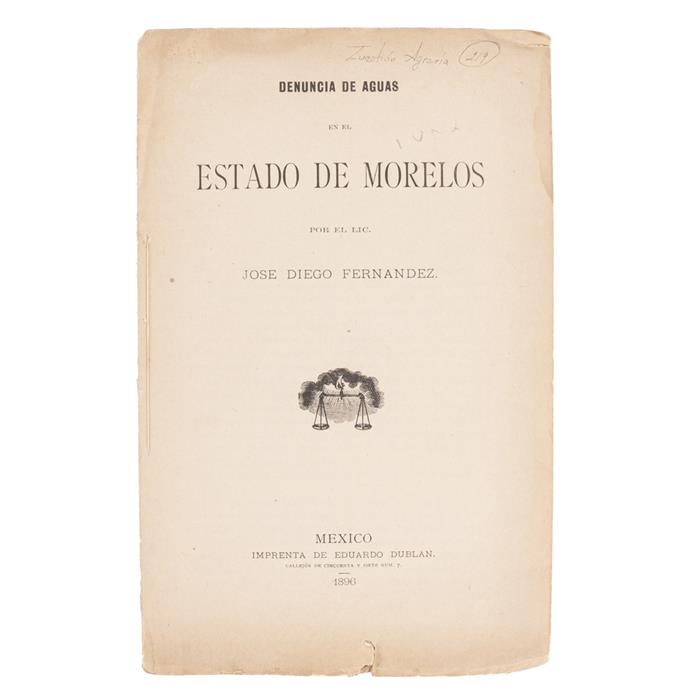 Fernández, José Diego.Denuncia de Aguas en el Estado de Morelos. México: Imprenta de Eduardo Dublán, 1896. 4o., 25 p. Texto con manchas de humedad en margen externo, rasgado en margen inferior. Sin pastas.