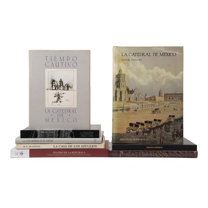 Subasta 1147T, Lote # 305 Libros sobre la Catedral de México, Zócalo, y Palacio de Bellas Artes. a) Toussaint, Manuel. La Catedral de México y el Sagrario Metropolitano, su historia, su tesoro, su arte. México: Editorial Porrúa, 1992. XXXVIII + 377 p. Edición de 2,000 ejemplares. Ilustrado. Encuadernado en pasta dura. b) Tovar y de Teresa, Rafael (presentación). La Construcción del Palacio de Bellas Artes. México: INBA, 1994. 395 p. Edición de 750 ejemplares. Ilustrado. Encuadernado en rústica. c) Leal, Felipe. Plaza de la República. Restauración y rehabilitación de la Plaza y Monumento a la Revolución. México: Gobierno del Distrito Federal, 2011. 179 p. Primera edición. Textos en español e inglés. Ilustrado. Encuadernado en pasta dura. d) Celorio, Gonzalo. Tiempo Cautivo. La Catedral de México. México: Miguel Ángel Porrúa, 1982. 68 p. Ilustraciones por Carmen Parra. Encuadernado en pasta dura. e) Catedrales de México. México: Publicaciones CVS, 1993. 267 p. Con dedicatoria al antiguo propietario. Ilustrado. Encuadernado en pasta dura. f) Garrido del Toral, Andrés. Teatro de la República. México: Camara de Diputados, 2016. 175 p. Recinto de los Constituyentes y la Constitución de 1917 y su Colección de Manuscritos Pastrana Jaimes. Primera edición. Edición de 1,000 ejemplares. Ilustrado. Encuadernado en pasta dura. g) Escobosa de Rangel, Magdalena. La Casa de los Azulejos. México: San Ángel Ediciones, 1986. 131 p. Reseña histórica del Palacio de los Condes del Valle de Orizaba. Ilustrado. Encuadernado en pasta dura. h) Sarukhán, José. La Universidad en el Espejo. México: UNAM, 1994. 183 p. Primera edición. Ilustrado. Encuadernado en pasta dura. Total de piezas: 8. Estimado $1,000-2,000