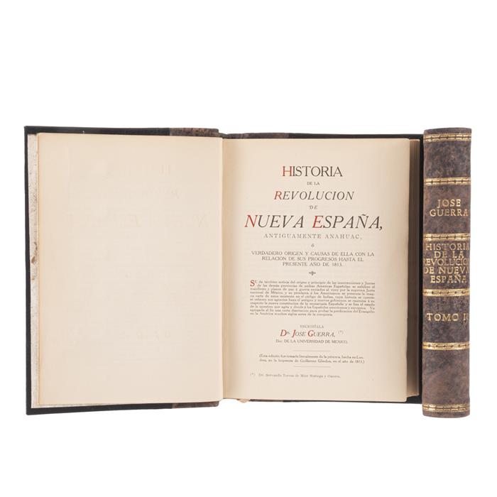 8o. marquilla, 2 h. + XLIII + 324 p.; 325 + XLV p. + 1 h. Verdadero origen y causas de ella con la relación de sus progresos hasta el presente año de 1813. Esta edición fue tomada literalmente de la primera, hecha en Londres, en la Imprenta de Guillermo Glindon, en el año de 1813. Tomo I: Con sellos de antigua biblioteca. Tomo II: Portada manchada. Encuadernados en pasta dura, lomo en piel. Piezas: 2.