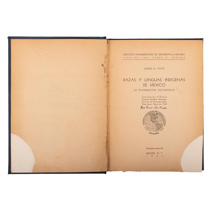 HA - Vivó, Jorge A. Razas y Lenguas Indígenas de México. México: Instituto Panamericano de Geografía e Historia, 1941. 4o. marquilla, 38 p.; 32 Cartas Antropofísicas y Lingüisticas, plegadas; Apéndice: Ilustraciones de Tipos Raciales (4 hojas). Cuatro Cartas Geográficas de la República Mexicana, plegadas (por separado): Estatura, Índice Cefálico y Lenguas Indígenas de México. Dedicado y firmado por el autor. Sellos de antiguo propietario. De anteportada y hasta la página 30, falto de punta inferior. Encuadernado en pasta dura. Estimado $3,000-4,000
