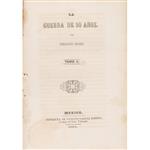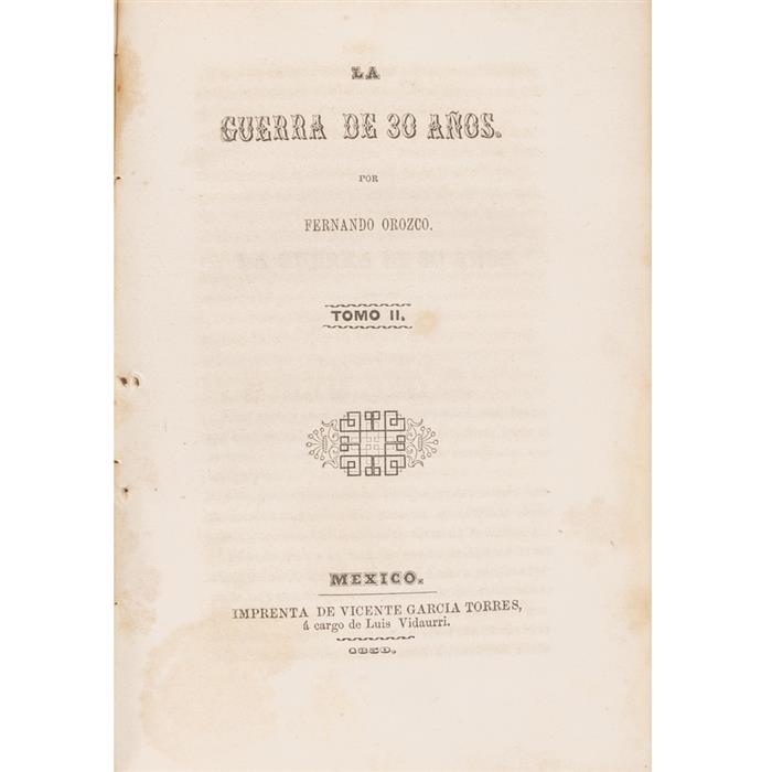 Orozco y Berra, Fernando.La Guerra de 30 Años. México: Imprenta de Vicente García y Torres, 1850. 8o. marquilla, 343 + 338 p. (Dedicatoria a Manuel Orozco y Berra, hermano del autor). Tomos I - II en un volumen. Primera edición. Error de encuadernación en páginas 17 - 48. Pequeños faltantes en lomo. Encuadernado en pasta dura, lomo en piel.