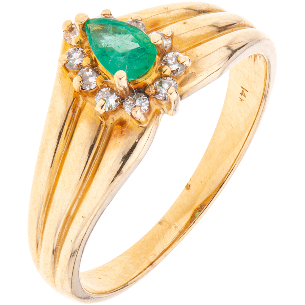Subasta 1089, Lote # 332 ANILLO CON ESMERALDA Y DIAMANTES EN ORO AMARILLO DE 14K Peso: 2.8 g. Talla: 7 1 Esmeralda corte pera ~0.15 ct Diamantes corte brillante ~0.07 ct Estimado $6,000-7,000