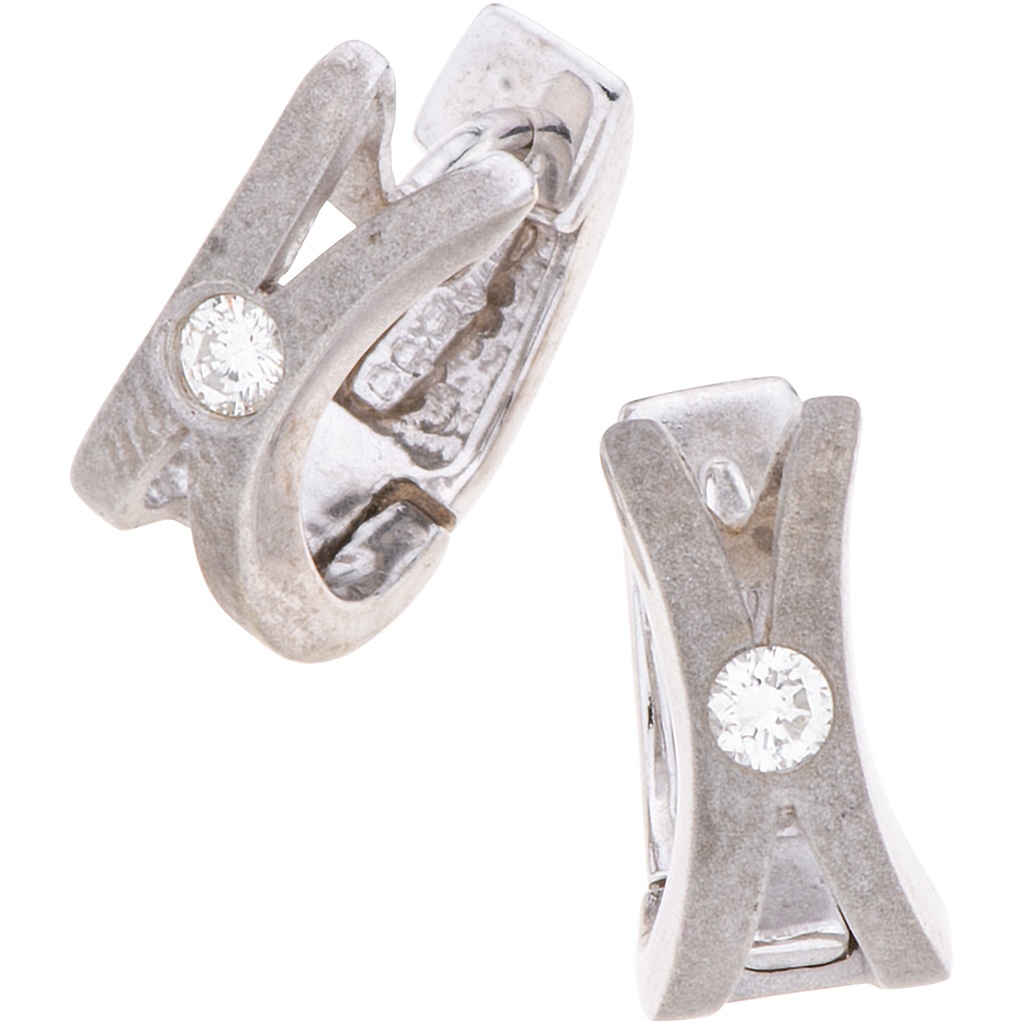Subasta 1089, Lote # 334 PAR DE ARETES CON DIAMANTES EN ORO BLANCO DE 14K Poste y seguro a presión. Peso: 4.3 g. Tamaño: 0.6 x 1.2 cm aprox. Diamantes corte brillante ~0.10 ct Estimado $6,000-7,000