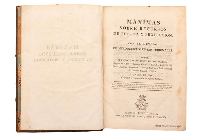 Covarrubias, Joseph de. Máximas Sobre Recursos de Fuerza y Protección, con el Método de Introducirlos en los Tribunales. Madrid: Por la Viuda de Ibarra e Hijos y Compañía, 1788. 4o. marquilla, VIII + 450 p. Tercera edición corregida y aumentada de algunas cédulas. Falto de cofia y pie. Encuadernado en pasta dura, en piel. Estimado $2,000-3,000