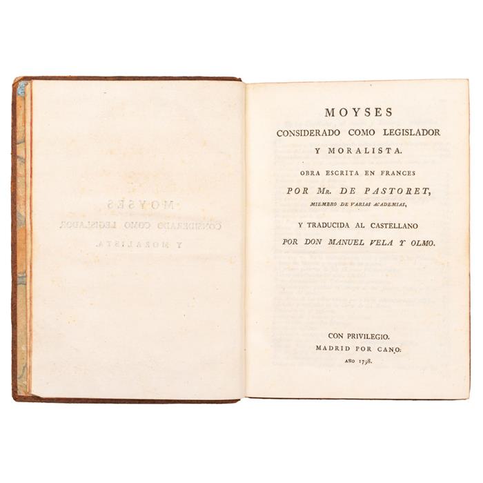 Pastoret, Claude Emmanuel. Moyses Considerado Como Legislador y Moralista. Madrid: Por Cano, 1798. 8o. marquilla, XIII + 383 p. Traducida al castellano por Don Manuel Vela y Olmo. Página 5 con pérdida de papel en margen superior. Cantos con mancha de humedad. Encuadernado en pasta dura, en piel. Estimado $2,000-3,000