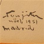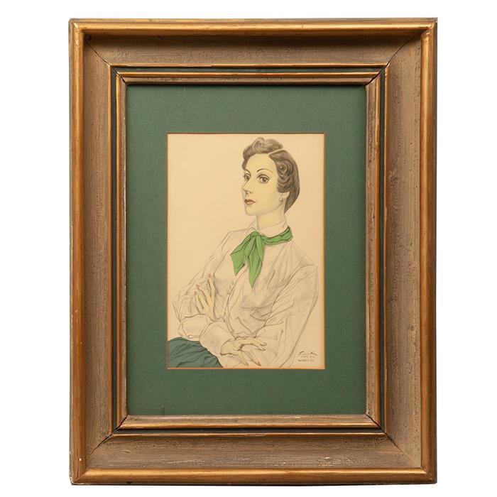 Subasta 1205T, Lote # 205 TSUGUHARU FOUJITA (Tokio, Japón, 1886 - Zúrich, Suiza, 1968) Madame Conchita Montes Firmada y fechada Madrid 1951 en plancha Litografía sin número de tiraje Enmarcada. Esta obra se trata de un retrato de la actriz española María de la Concepción Carro Alcaraz, conocida como Conchita Montes, quién interpretó numerosas obras de teatro y películas de gran éxito como "Correo de Indias, 1942", "La vida en un hilo, 1945", "El último caballo, 1950" y "Mi calle, 1960", entre otras. Fuente consultada: LIES, Elaine. "Nearly 40 works by Japanese artist Leonard Tsuguharu Foujita found by museum". Art Daily, septiembre de 2011, www.artdaily.org 31.4 x 22.2 cm medidas totales Estimado $20,000-30,000