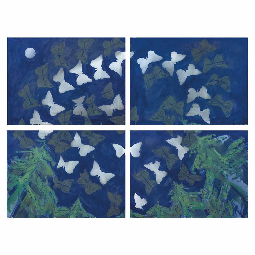 Subasta 1134, Lote # 6 CARMEN PARRA (Ciudad de México, 1944 - ) Vocación de un destino minúsculo, de la serie Eternidad de lo efímero, 1993 Firmado y fechado Siena 93 Gouache sobre papel, políptico Piezas: 4 Con constancia de autenticidad de Fundación Parra Gironella. Publicado en: PARRA, Carmen. Carmen Parra - Polvo de Estrellas. México. Secretaría de Educación Pública, 2000, portada. Presenta ligeros detalles de conservación. "Carmen Parra recoge en su pintura todo lo que las mariposas han representado para la cultura y por ende, lo que a ellas nos une. En sus cuadros, nos restituye esa figura, esa huella o dibujo con la que empiezan todas las mitologías y que hace que algo se vuelva atávico para el espíritu humano […] El motivo de la monarca es una alegoría para leer el mundo y reflexionar sobre la relación entre el ser humano y la naturaleza. La metamorfosis de la mariposa significa la aspiración del ser humano a encontrar siempre la luz en todos los sentidos, así como la posibilidad de renacer con nuevas utopías o cosmovisiones". Alicia García Bergua. Fuente consultada: DE LA FUENTE, Juan Ramón et al. Metamorfosis. México. Palacio de la Escuela de Medicina, Facultad de Medicina, UNAM, pp. 83 y 90. 55.5 x 75 cm cada uno Estimado $250,000-300,000