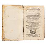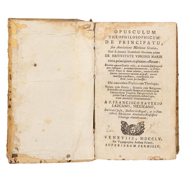 Lazcano, Francisco Xaviero. Opusculum Theophilosophicum de Principatu, seu Antelatione Marianae Gratiae Illud, S. Joannis Damasceni Oratione Prima de Nativitate Virginis Maria circa Principium Explanans Essatum. Venetiis: Ex Typographia Andrae Poletti, 1755. 16o. marquilla, XLVII + 571 p. Mancha de humedad en margen interno de tercio superior. Encuadernado en pergamino. Estimado $3,000-4,000