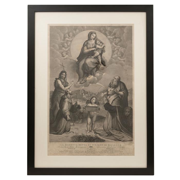Sanzio, Rafaello.La Madonna detta di Foligno. Mediados del Siglo XIX. Grabado, 72 x 47 cm. Ignazio Podio dis. Ignazio Pavon Romano inc. Papel deteriorado en tercio inferior, no afecta imagen. Enmarcado.