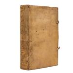 4o., 703 p. + 7 h. Marca de fuego. Algunas páginas con manchas de óxido, con puntos y surcos de polilla en margen interno, afectan poco el texto. Pastas y lomo por desprender. Encuadernado en pasta dura, en pergamino.