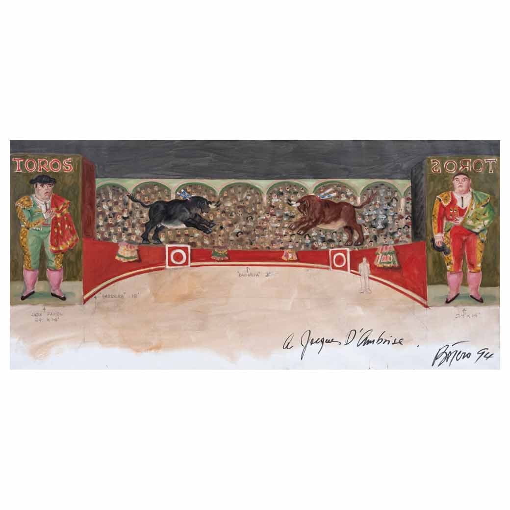 Subasta 1134, Lote # 65 FERNANDO BOTERO (Medellín, Colombia, 1932 - Mónaco, 2023 ) Diseño para telón de fondo de la ópera Carmen Firmado y fechado 94 Óleo y lápiz de grafito sobre tela Con dedicatoria a Jacques d'Amboise. Procedencia: perteneció a la colección del bailarín Jacques d'Amboise; colección privada, Christie's, Nueva York, Subasta de Arte Latinoamericano en línea, lote 45, 14 de marzo de 2023; colección privada. Esta obra fue un obsequio que Fernando Botero le hizo personalmente a Jacques d'Ambroise (1934-2021) quien fuese el bailarín principal del ballet de Nueva York. "-¿Alguna vez has tratado de entender el por qué de esa obsesión con los volúmenes, de ese deseo tuyo de dilatar los cuerpos y las proporciones? -No, no tengo explicación para ello. Ahora, volviendo a ver algunos dibujos y acuarelas de cuando era niño, creo que puedo decir que esto me pasaba aún entonces, que yo buscaba estos volúmenes, estos espacios. ¿Por qué? Ah, ah… quizás ese es un problema para planteárselo a un psicólogo, ¿no crees? Quizá es porque yo era muy delgado… No, en realidad no sé. Hoy día soy capaz de racionalizar mi interés por formas, por volúmenes, por lo que Berenson llama -valores táctiles-. Pero cuando empecé a pintar no conocía ni a Giotto ni a Berenson. No, no puedo explicarlo. Pero cuando pinté esa mandolina era distinto, me di cuenta de que era la forma que había estado buscando. Así pues, empecé a construir mi mundo, mi pintura". Fernando Botero en entrevista con Miriam Maffei. Fuente consultada: MAFFEI, Miriam, TESTORI, Giovanni y SCIASCIA, Leonardo. Fernando Botero, La Corrida. España. Ernesto Armitano Editorial, 1997, pág. 23. 62 x 131.5 cm Estimado $7,200,000-8,500,000