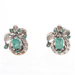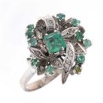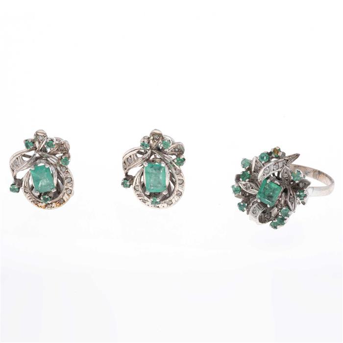 Anillo y par de aretes vintage con esmeraldas y diamantes en plata paladio.