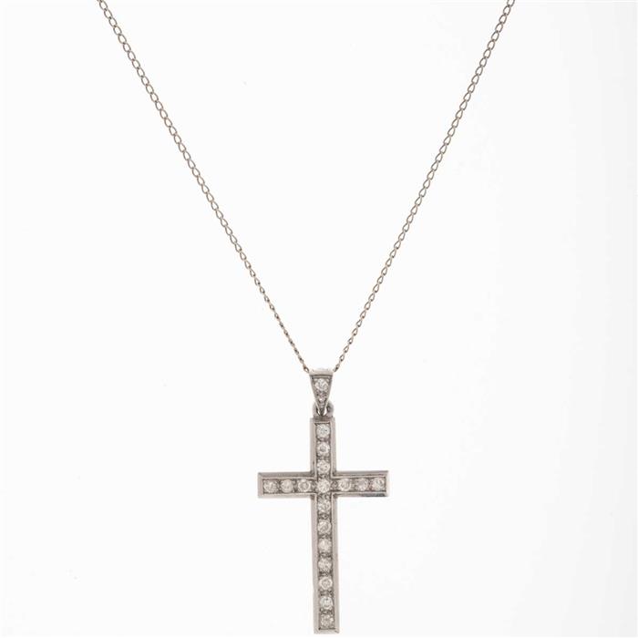 Subasta 1205T, Lote # 315 Collar y cruz con diamantes en platino y oro blanco de 10k. 17 diamantes corte 8 x 8. Peso: 3.8 g. Estimado $3,500-4,000