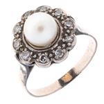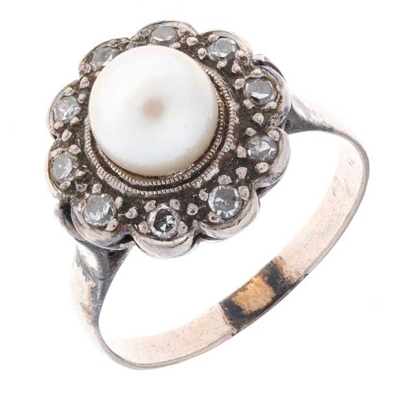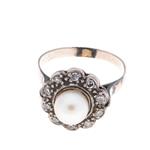 Subasta 1205T, Lote # 318 Anillo vintage con perla y diamantes en plata paladio. 1 perla cultivada color crema. 10 diamantes corte 8 x 8. Talla: 6. Peso: 3.2 g. Estimado $1,200-2,000