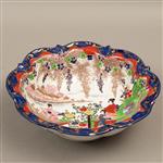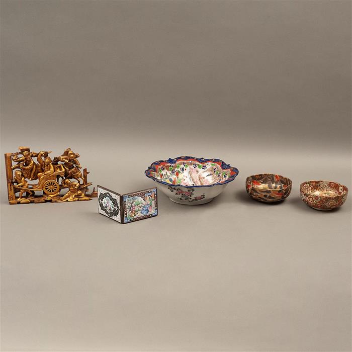 Madera, metal y porcelana; decoraciones policromadas, diseños de tipo oriental; modelos diferentes Consta de: frutero, 2 centros, cigarrera y relieve