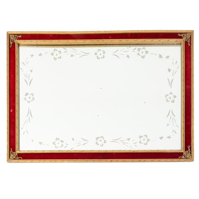 ESPEJO SIGLO XX Elaborado en madera y resina dorada Luna rectangular decorada con esgrafiados Con maria luisa tipo terciopelo rojo Decorado con elementos orgánicos, vegetales y molduras Detalles de conservación, marcas de uso y raspaduras Estimado $1,800-3,000