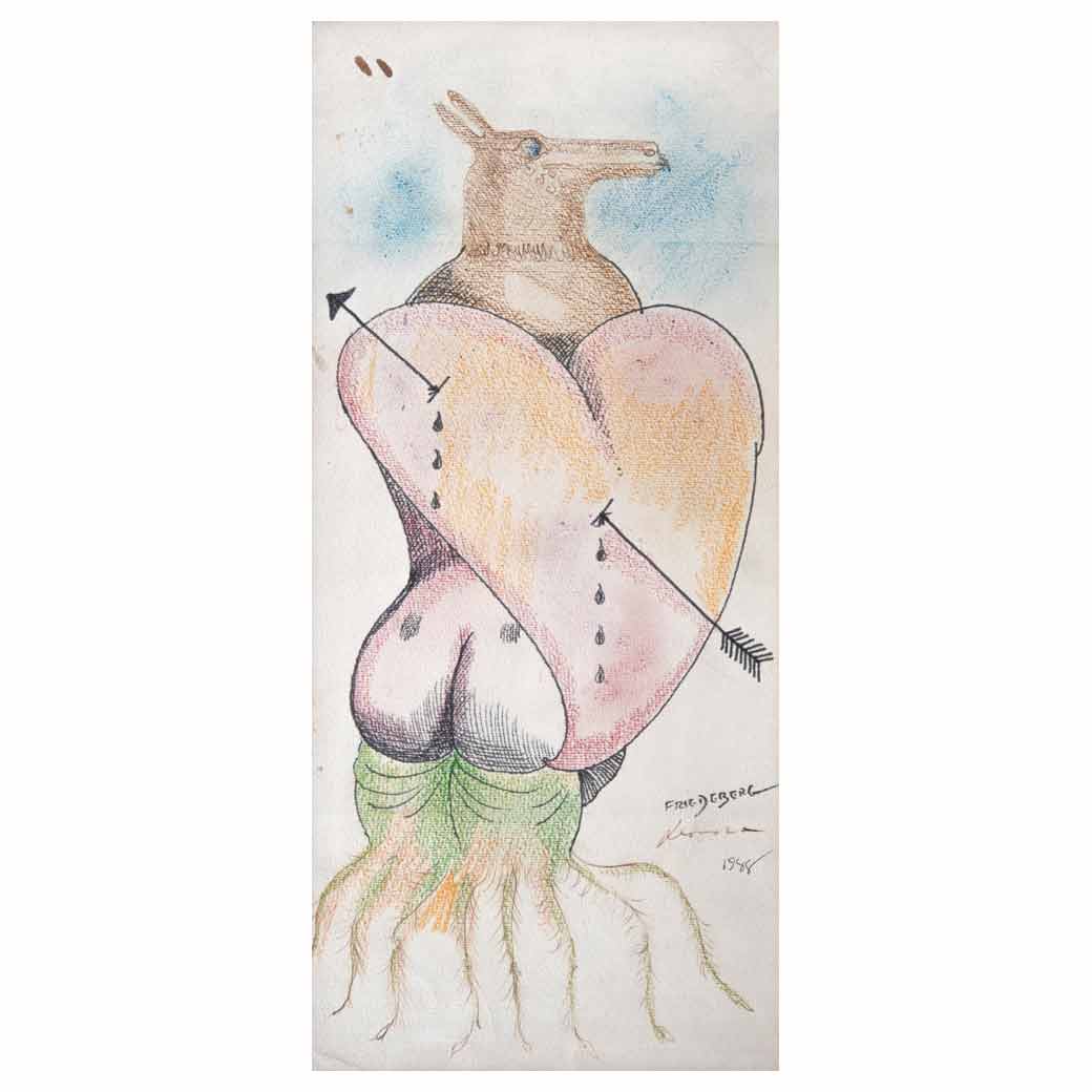 Subasta 1134, Lote # 59 LEONORA CARRINGTON y PEDRO FRIEDEBERG (Lancashire, Inglaterra, 1917 - Ciudad de México, 2011) (Florencia, Italia, 1936 -) Cadáver exquisito Firmado por ambos artistas y fechado 1988 Lápices de color y tinta sobre papel Procedencia: perteneció a la colección de Pedro Friedeberg. Presenta detalles de conservación. El "cadáver exquisito" se extendió al dibujo, dando como resultado imágenes alucinantes, figuras imposibles en las que el ensamblaje de imaginaciones se traducía en una unidad de conjunto. Este recurso fue empleado en nuestro territorio por aquellos artistas insertados en el contexto del surrealismo en México. Leonora Carrington y Pedro Friedeberg, quienes entablaron una relación estrecha, realizaron varios ejercicios con esta técnica, en los que sobresalen alusiones a la sexualidad y figuras antropomorfas que podrían traducirse como seres mitológicos. Fuente consultada: OÑORO, Cristina. Historias de mujeres en el exilio: La amistad creativa de Remedios Varo y Leonora Carrington. Francia, Recherches, 2012, pp. 69-87. Derechos Reservados © Pedro Friedeberg Copyright Estate of Leonora Carrington /ARS 37 x 17 cm Estimado $360,000-400,000