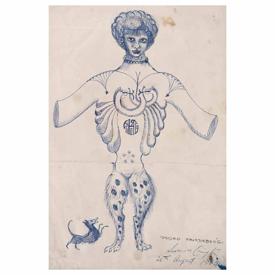 Subasta 1134, Lote # 58 LEONORA CARRINGTON y PEDRO FRIEDEBERG (Lancashire, Inglaterra, 1917 - Ciudad de México, 2011) (Florencia, Italia, 1936 -) Cadáver exquisito Firmada por ambos artistas y fechada 1964 Tinta sobre papel Procedencia: perteneció a ala colección de Pedro Friedeberg. Presenta detalles de conservación. El "cadáver exquisito" es una técnica de creación colectiva que nació en el ámbito literario y que luego migró a las artes visuales para ser usado como herramienta plástica. Se relaciona con el automatismo, un modo de producción atribuido al surrealismo, vanguardia que se basó en la liberación del inconsciente. Su nombre viene de uno de los primeros ejercicios que se realizaron con esta técnica en 1925, donde al develarse la frase creada de manera colectiva y automática por un grupo de escritores y poetas donde se encontraban Robert Desnos, André Bretón y Tristán Tzara. Esta decía "El cadáver exquisito beberá el vino nuevo". Reunidos seguramente en el café Voltaire de Zúrich, estos tres artistas pusieron a prueba uno de los postulados elementales del movimiento: la inclusión del azar en el proceso creativo. La premisa era sencilla: en un papel, cada uno de los participantes debía escribir una palabra o frase sencillas, a continuación, esa parte era ocultada mediante un pequeño pliegue y otro participante continuaba la obra sin conocimiento de lo precedente. Fuente consultada: OÑORO, Cristina. Historias de mujeres en el exilio: La amistad creativa de Remedios Varo y Leonora Carrington. Francia, Recherches, 2012, pp. 69-87. Derechos Reservados © Pedro Friedeberg Copyright Estate of Leonora Carrington /ARS 38 x 26 cm Estimado $480,000-550,000